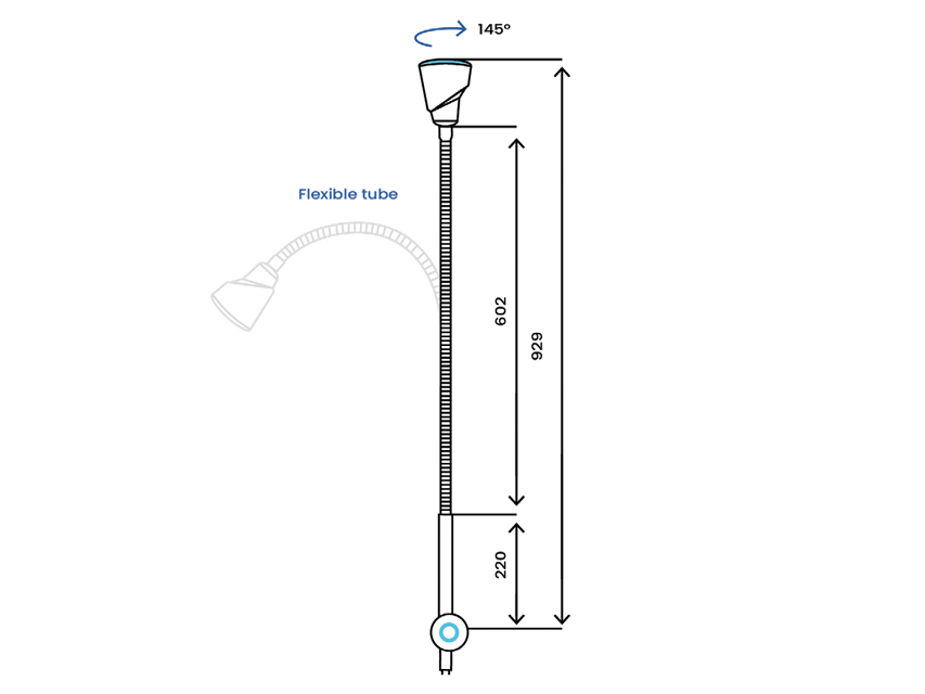 The flexible arm ensures easier light positioning and is covered with a smooth white shrink-wrap sheath for easier cleaning and disinfection.